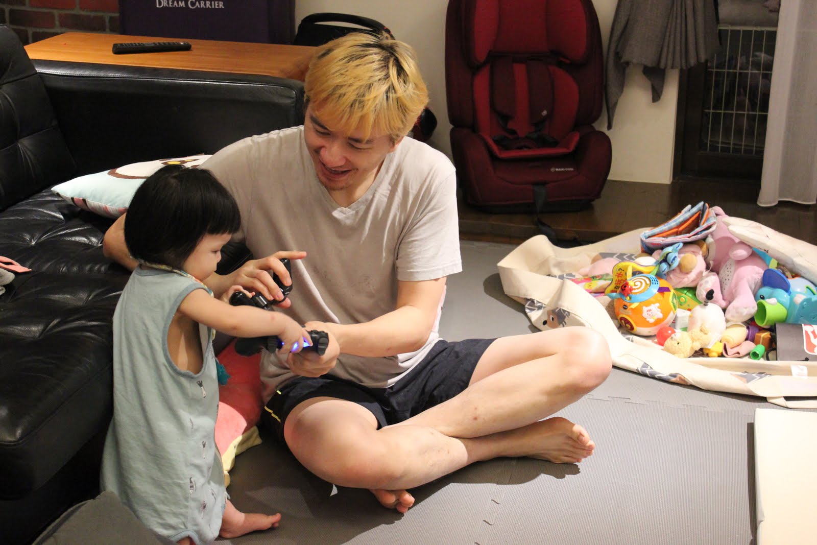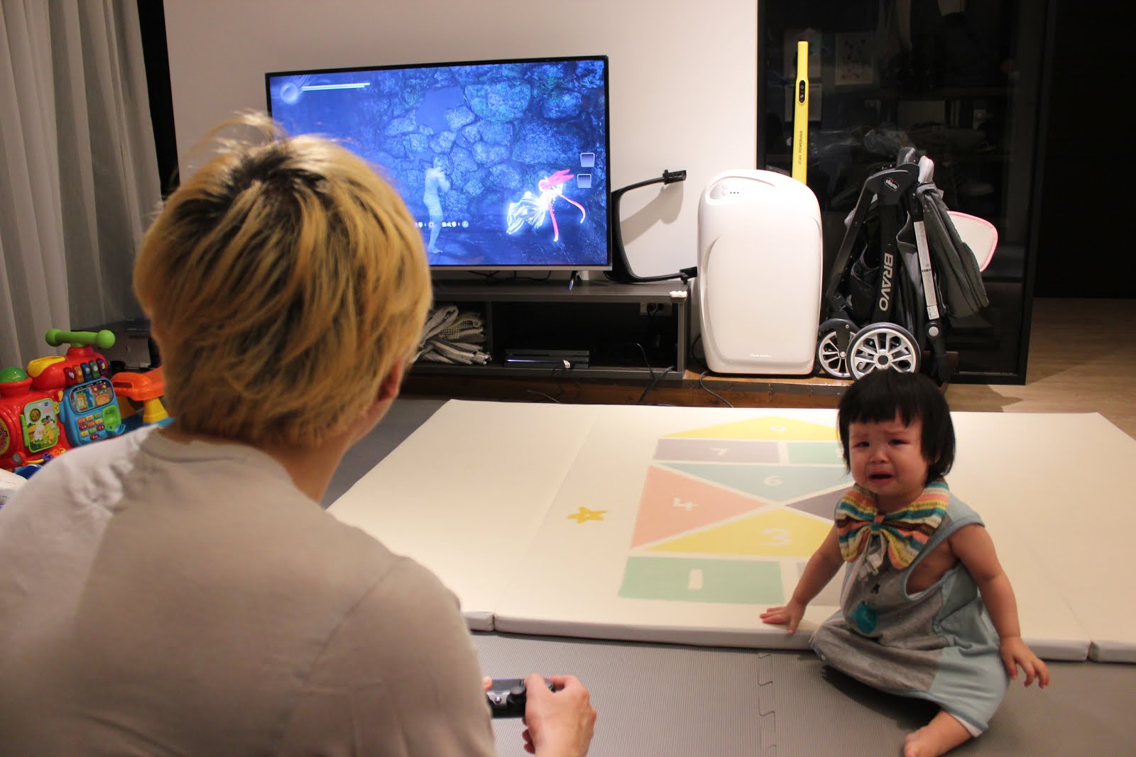 「別哭了,去玩積木車!這邊過關就換你!」我使出了30年前兄弟搶電動打的爛招,過關就是破關的意思,你有得等了。
