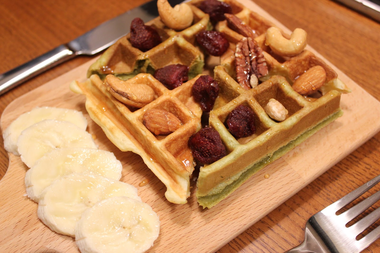 將完成的鬆餅拿起,用刀進行X型對切,灑上鳳梨果乾、堅果和蜂蜜,完成!