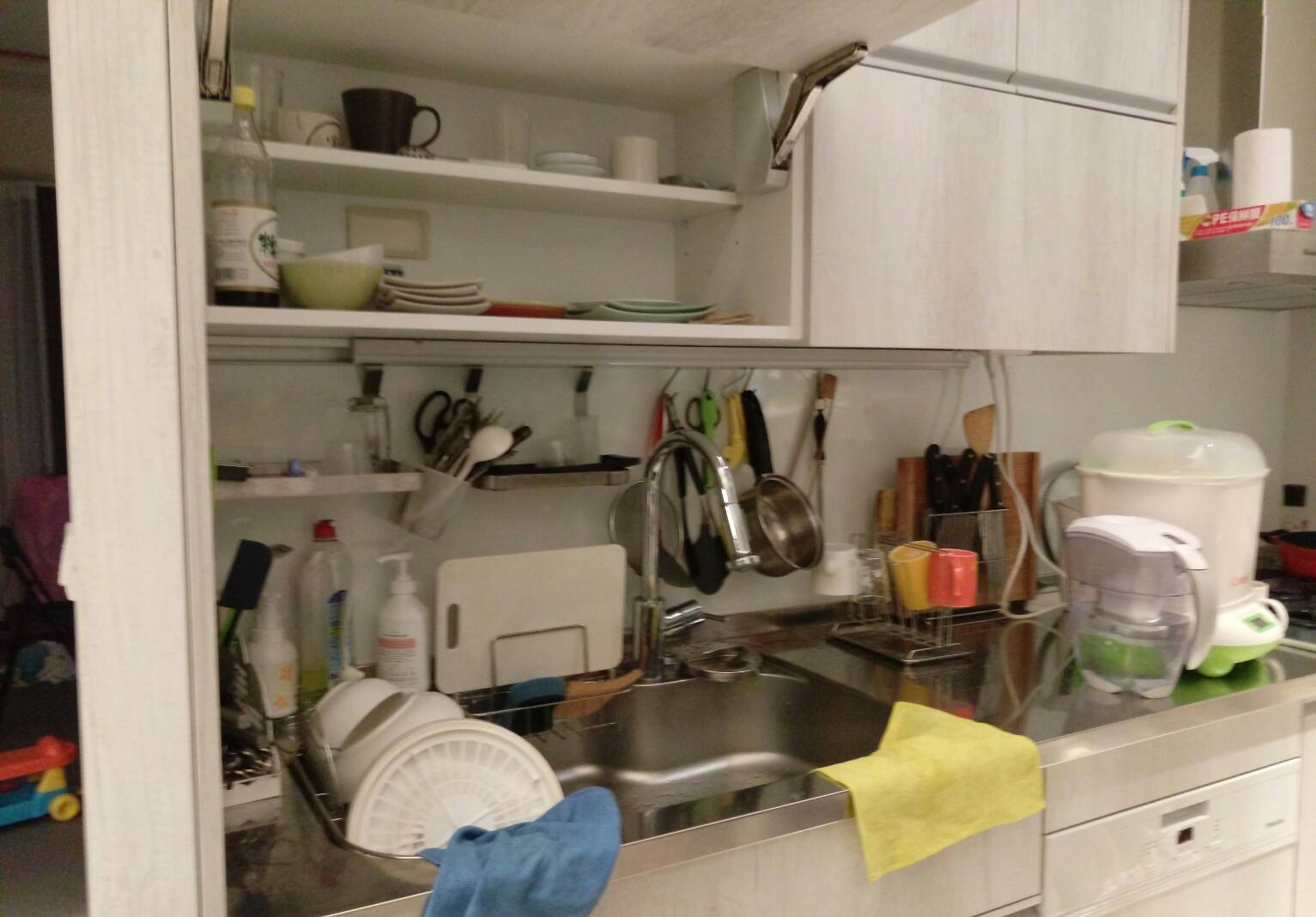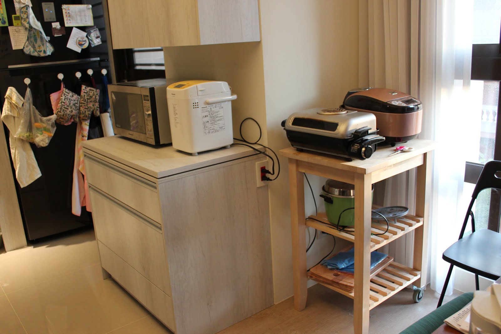 但可惜最後還是無法囊括小餐車上的電器….要將奶瓶消毒鍋/熱水瓶/鍋寶IH電子鍋/微波爐/烤魚機/麵包機/氣泡水機 全部收納起來的空間實在太嚇人,如果要全部上桌面,洗碗機上面的平台就要放電器了…