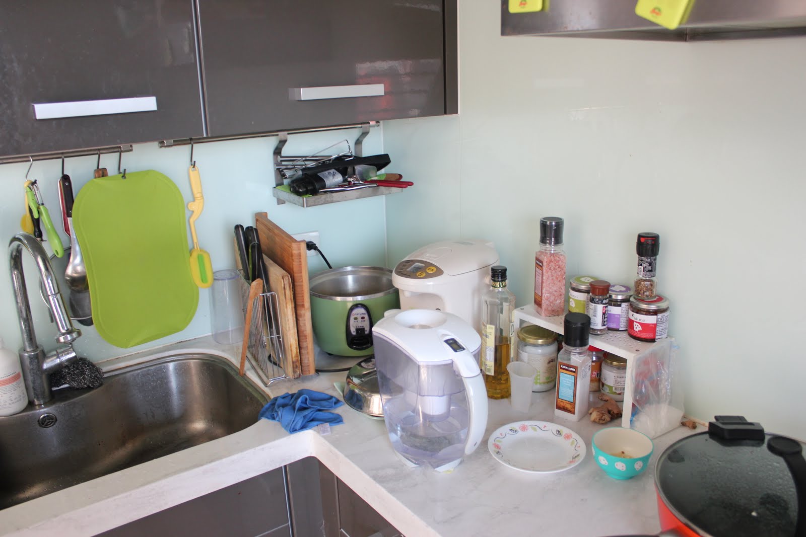 現在水槽與瓦斯爐中間的空間被杯架與菜刀砧板架侵蝕當中,但怎樣都比以前強一百倍!