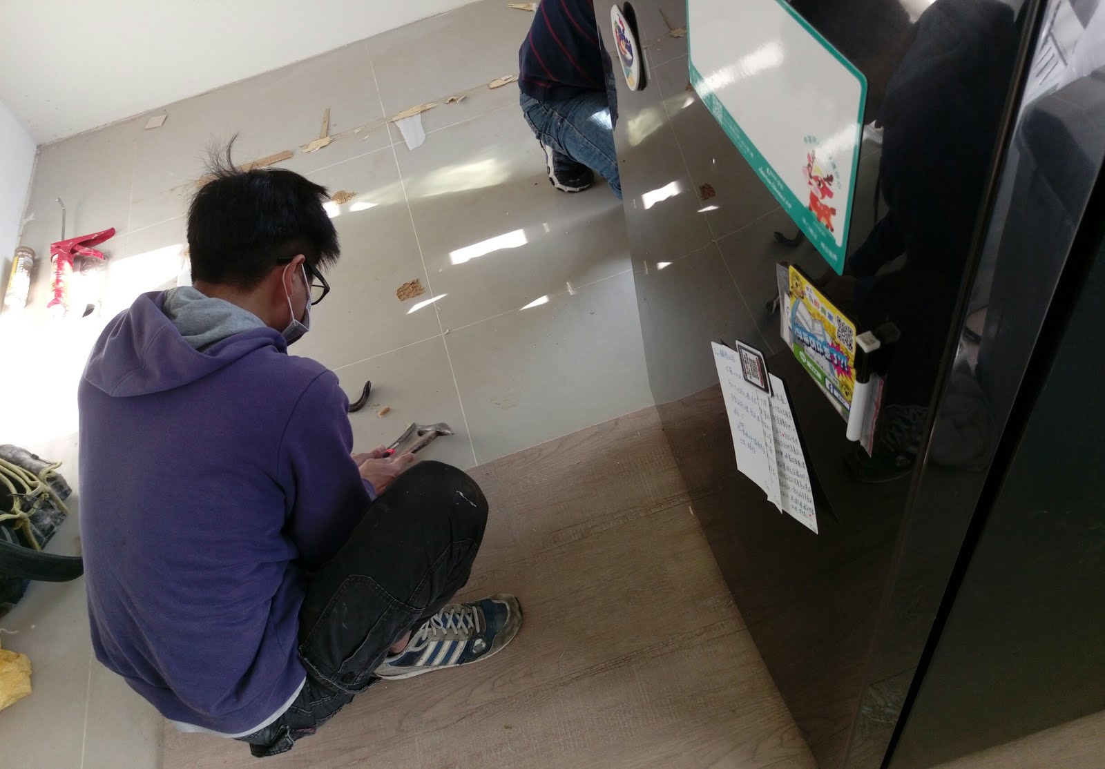 改造後是95公分,為了裝洗碗機跟冰箱移位,1公分厚的木地板拆掉了,露出原來的磁磚表面,是實實在在的95公分高!