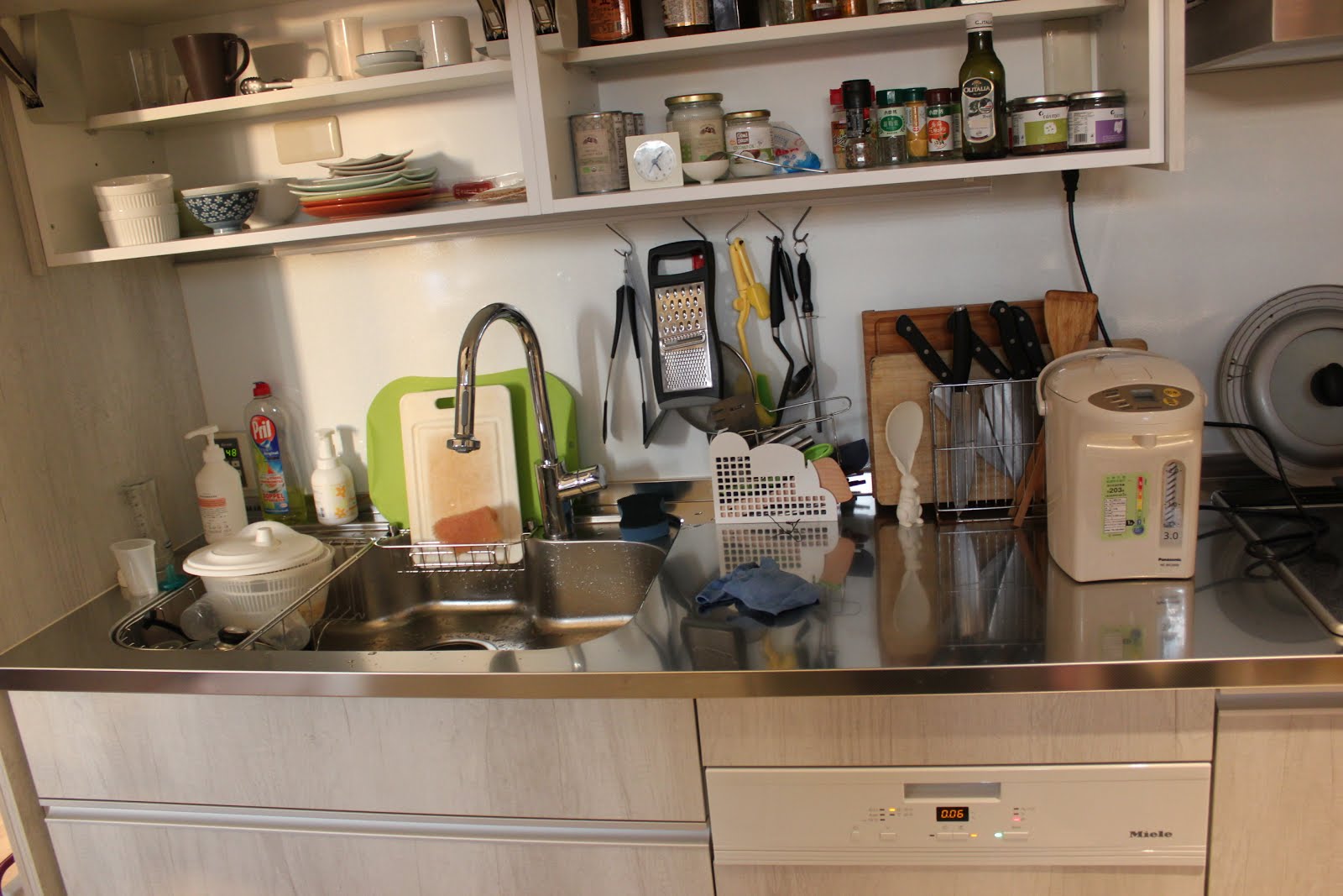 發完問題的隔天,煮完她的居家生日大餐後,面對堆積如山的碗盤~更加深了她想要裝設洗碗機的決心,可廚房沒有大改是放不下洗碗機的。