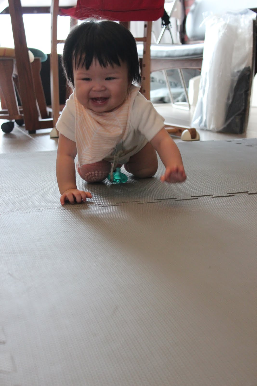 隱藏角色選擇了「EVA發泡地墊」也就是俗稱的巧拼來當作小孩爬行墊,有兩個優點。