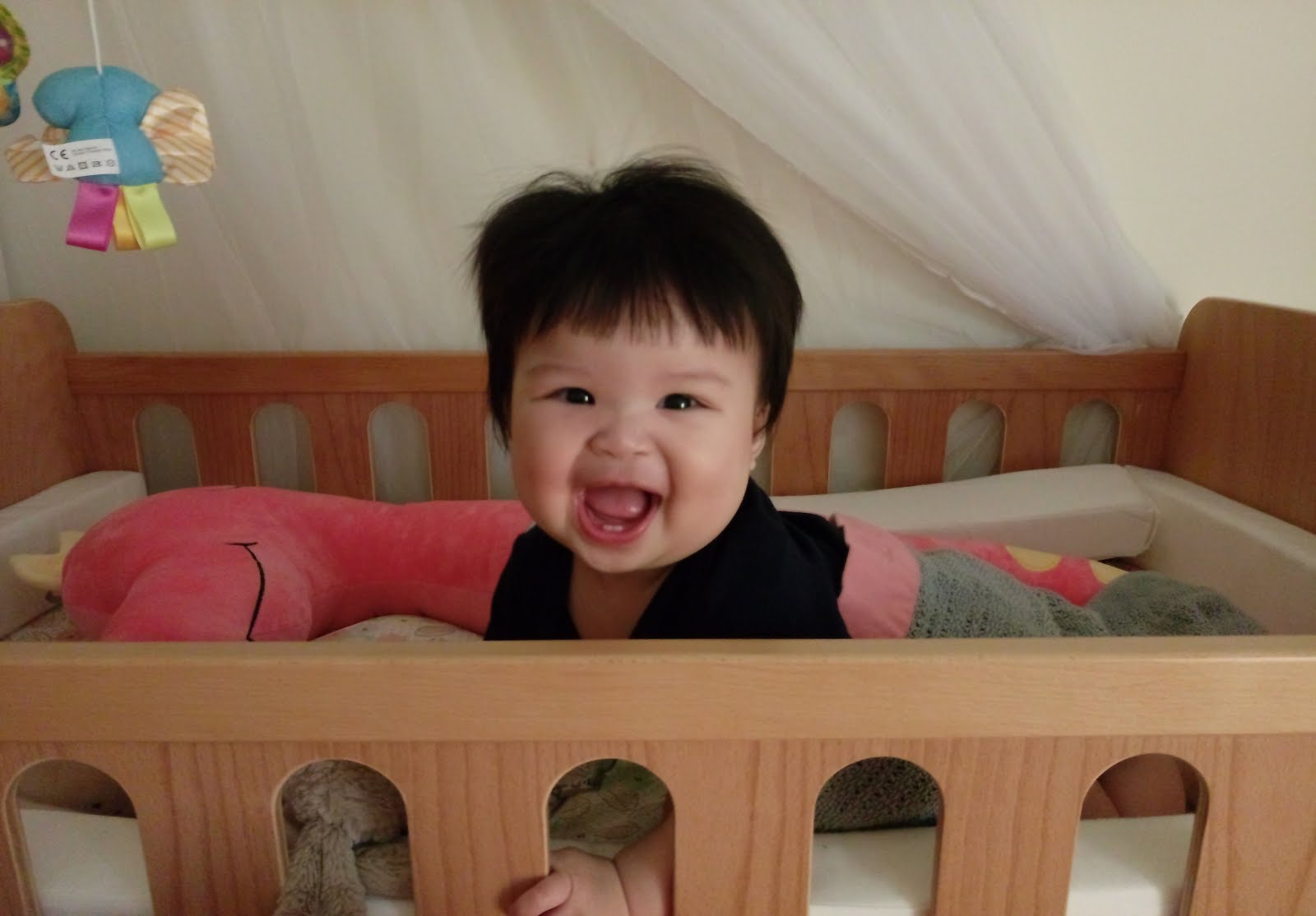 果然六個半月大的時候就非常喜歡在地上緩緩蠕動,當時隱藏角色是用圍欄圈住,放在彈簧床上面。