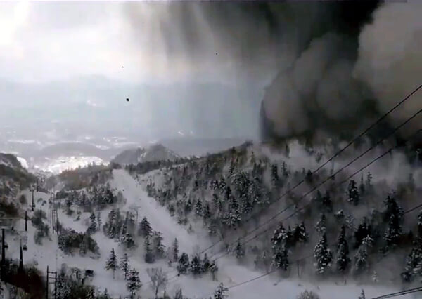 (白根山噴發現場,可以看到石頭亂飛,不是你螢幕太髒)引發雪崩埋了人且火山爆發噴出的石頭打破了滑雪場的玻璃,造成15人受傷。
