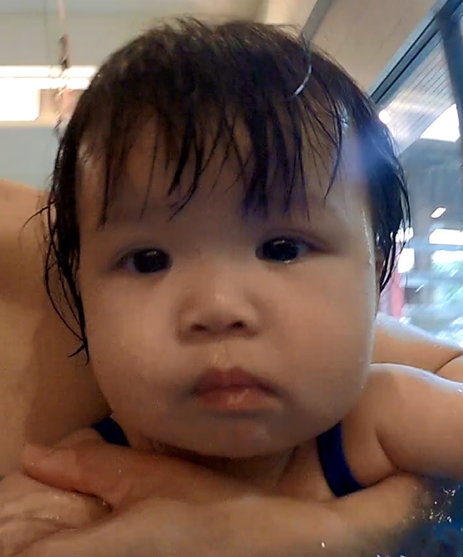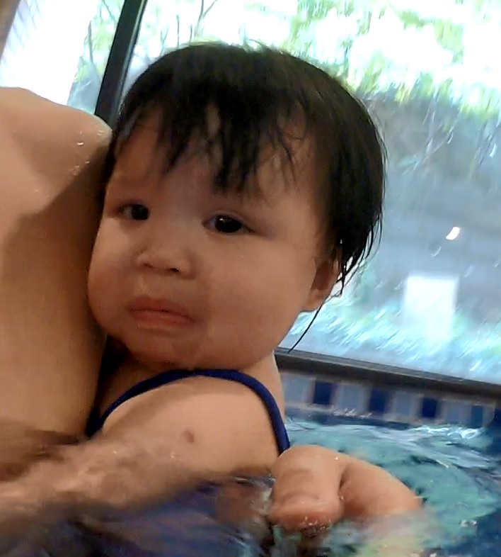 可能是因為太早起床太早來,還是泳池的回音太多,軟Q有點厭世臉。