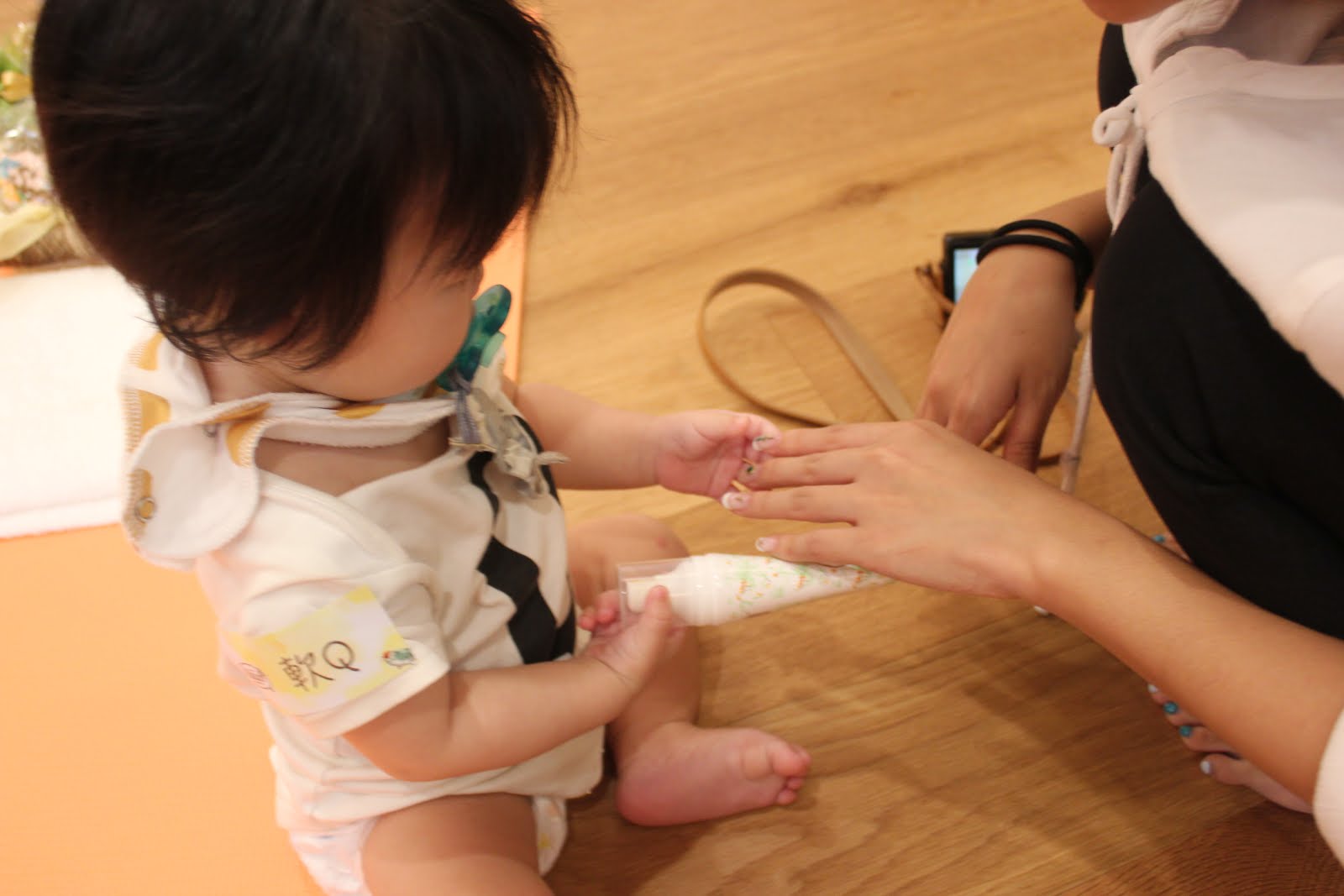 我們跟著按摩導師的帶動,幫寶寶作親子全身按摩,先噴一點沙棘按摩油在手心,在手中搓熱,再用整個手掌幫寶寶按腿。
