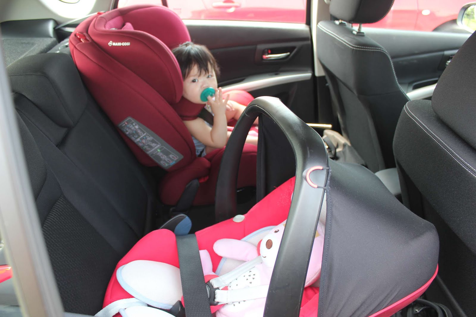 先模擬一下日後一家四口的感覺,汽座跟提籃一起安裝上去看看,後座放下兩個汽座就是滿員的狀態。